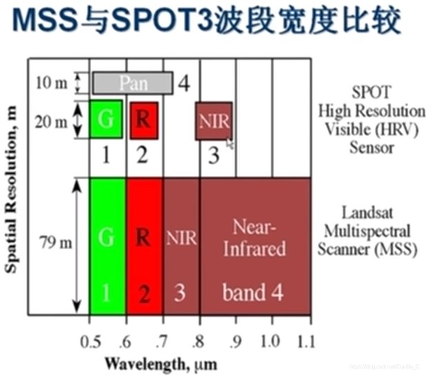 - 波谱:Landsat1-3有5个波段,MSS4(绿)、MSS5(红)、MSS6(红外)、MSS7(红外)、MSS8(热红外)