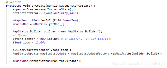 MainActivity.java的onCreate函数中构建地图状态,实例化经纬度center和缩放等级zoom对象1