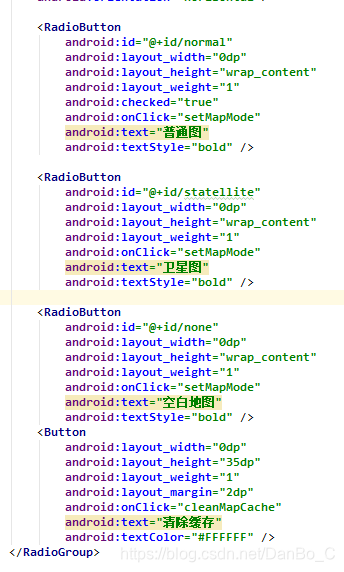 MainActivity.java中添加Button的点击事件的处理函数,清除地图缓存数据,支持清除普通地图和卫星图缓存,再次进入地图页面生效。