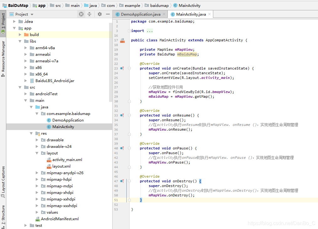 MainActivity.java中添加管理MapView生命周期函数代码