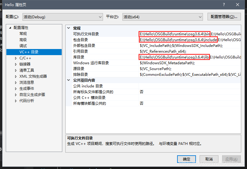 项目右键,打开属性,选择VC++目录,给可执行文件目录添加路径为osg下面的bin,包含目录添加路径为osg下面的include,库目录添加为osg下面的lib目录。